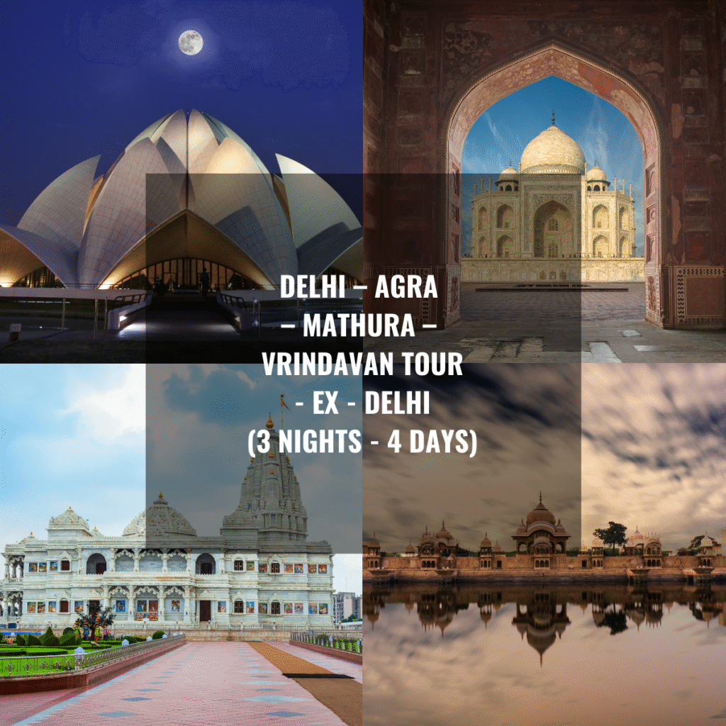 The Delhi–Agra–Mathura–Vrindavan Tour Package is a perfect blend of heritage sightseeing and spiritual exploration, designed for travelers who want to experience India’s rich history along with deep devotional sites. Starting from Delhi, the tour takes you to Agra, home of the world-famous Taj Mahal, followed by Mathura, the birthplace of Lord Krishna, and Vrindavan, the land of divine love and devotion.