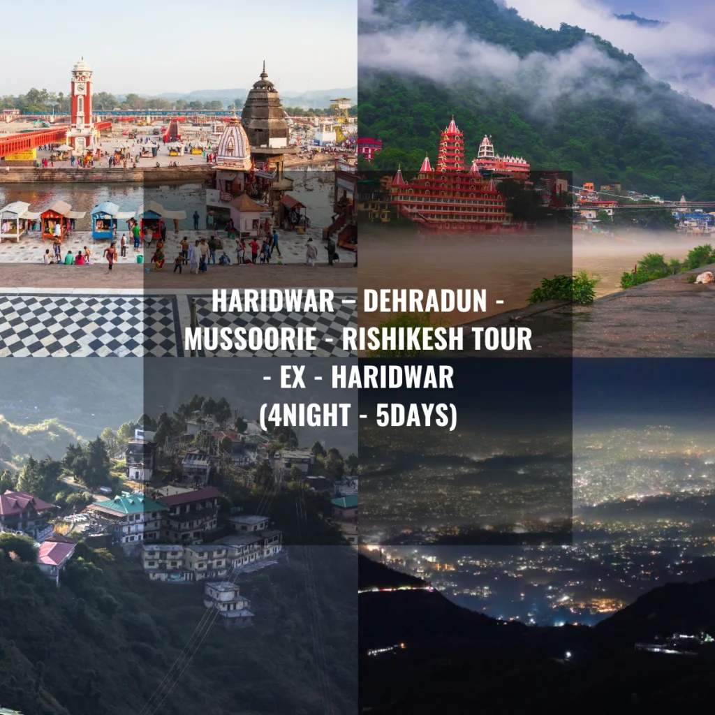 The Haridwar – Dehradun – Mussoorie – Rishikesh Tour Package is a beautifully designed journey that combines spiritual experiences, hill-station charm, and adventure in the heart of Uttarakhand. From the sacred ghats of Haridwar and the peaceful banks of the Ganga in Rishikesh to the scenic hills of Mussoorie and the attractions of Dehradun, this tour offers a perfect mix of devotion, nature, culture, and leisure.